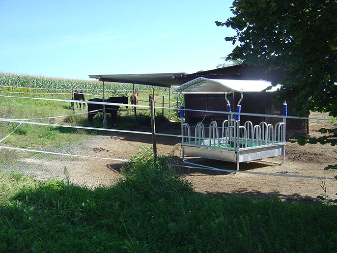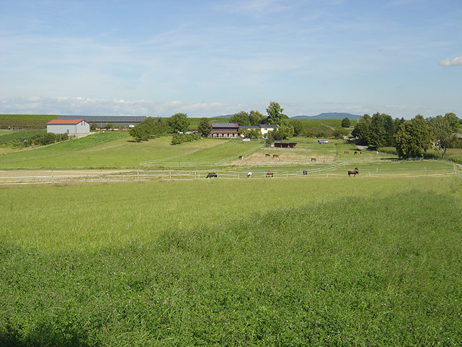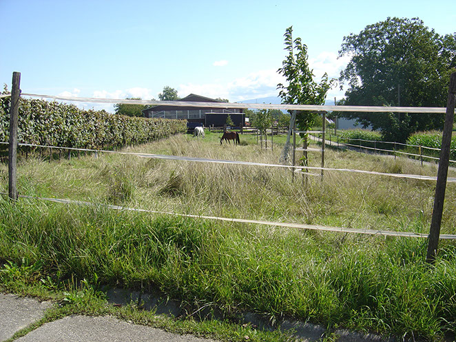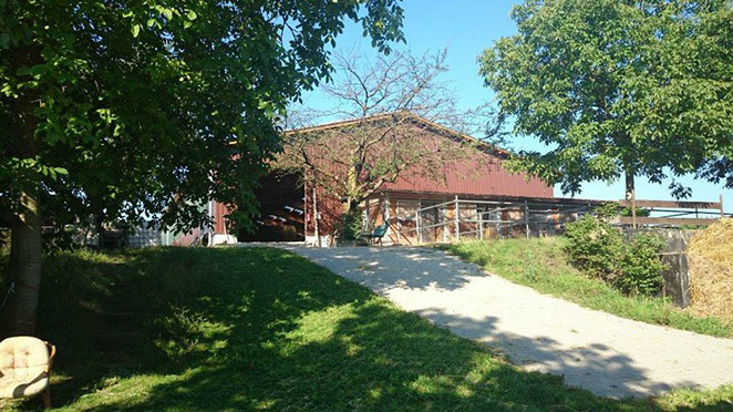 Die Halle (20 x 40 m) wurde 2011 erbaut, mit großen Lichtfeldern und Windschutznetz